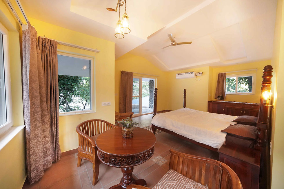 The last Cottage has more than a couple of USPs. A corner garden of its own, a loft with a skyview and it's most special feature a 6 ft by 12 ft large Glass Window ensures that you feel the forest and river around and amidst you.